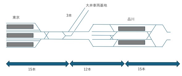 ところで、なぜ品川駅ができると、最高下り12本のダイヤを15本にできるのか。これは線路の構造による。列車が折り返す時に運行本数のロスがあり、なおかつ回送列車があるからだ。