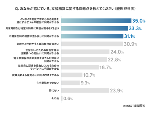 立替精算の課題を尋ねた。最も多かったのは「インボイス制度で求められる要件を満たすかどうかの確認に手間がかかる」(35.0%)、次いで「月末月初など特定の時期に業務が集中してしまう」(33.3%)、「不備発生時の確認や差し戻しに手間がかかる」(31.1%)だった。インボイス制度によってさらに負担が増加していることがうかがえる結果となった。
