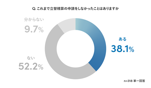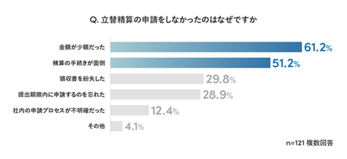 非経理担当者のうち、これまで立替精算をしなかったことが「ある」と回答した割合は38.1%だった。立替精算をしなかった理由については、「金額が少額だった」が61.2%と最も多く、次いで「精算の手続きが面倒」(51.2%)、「領収書を紛失した」(29.8%)だった。