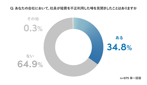 毎月立替精算を1件以上しているビジネスパーソン(経理・非経理問わず)のうち、所属企業において社員が経費を不正利用したうわさを見聞きしたことが「ある」と回答した割合は34.8%と、約3人に1人の割合で見聞きしたことがあることが分かった。