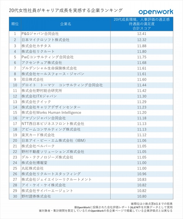 オープンワーク(東京都渋谷区)が運営する働きがい研究所は、「20代女性社員がキャリア成長を実感する企業ランキング」を発表。1位は「P&Gジャパン」だった。
