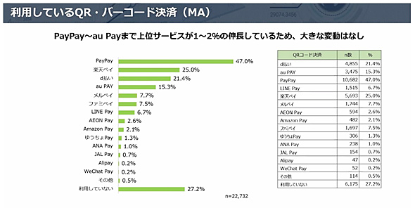 次に「PayPayポイント」について見ていこう。「QRコード決済のPayPayが圧倒的な顧客基盤を持つ。PayPayを中心に力を入れていく動きになってくる」と吉本氏。コード決済の利用は、PayPayが47.0%と他にダブルスコアを付けて圧倒的だ。このPayPayをスーパーアプリ化し、金融を中心とした各サービスにつなげていくのが基本的な作戦になる。