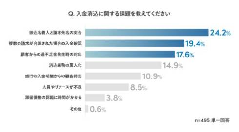 以降は「複数件の請求分を合算して入金された場合の確認が困難」(19.4%)、「顧客からの一部入金や過不足金の発生時の対応が困難」(17.6%)と続いた。