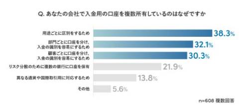 保有している入金用の口座数は平均17.3件だった。複数の入金用口座を保有している理由について、最も多かったのは「用途ごとに区別をするため」で38.3%。以降は「顧客ごとに専用の口座を使い、入金の識別を容易にするため」(32.1%)、「顧客ごとに口座を分け、入金の識別を容易にするため」(30.3%)となった。