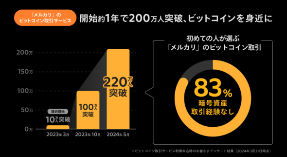 新規ユーザー開拓に注力していることも特徴の1つだ。「他社と競合してユーザーを取り合うというより、全然別の場所でこの領域を開拓する。(暗号資産の)入り口としての立場はより色濃くなってきた」と中村氏は語る。実際、「メルコインが獲得した200万を超える方々も、8割以上は暗号資産が初めての初心者」だ。