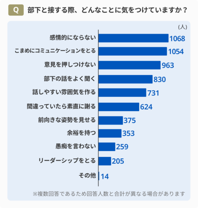 部下と接する際に気をつけていることは「感情的にならない」(1068人)が最も多かった。その他「こまめにコミュニケーションをとる」(1054人)、「意見を押しつけない」(963人)、「部下の話をよく聞く」(830人)といった回答が多く寄せられた。また、この質問は回答者2432人に対して回答件数は6479件に上り、1人あたり2.6個の「気をつけていること」があると分かった。