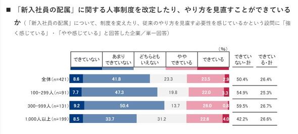 50%以上の会社が「新入社員の配属について、制度を変えたり、従来のやり方を見直す必要を感じている」──このことが、就職みらい研究所を運営するリクルートの調査で明らかになった。