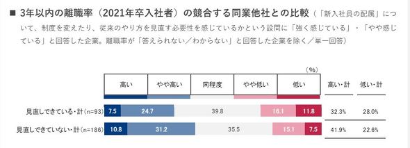 また3年以内の離職率について、競合する同業他社と比較した結果、「高い」と回答した割合は「見直しできている企業」が32.3%、「見直しできていない企業」は41.9%と、ここでも約10ポイントの差が見られた。
