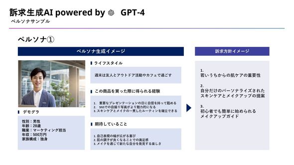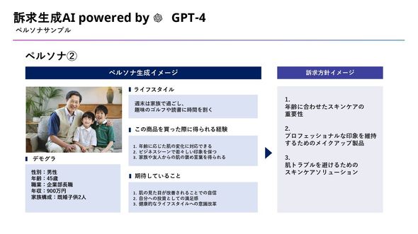 石井: 続いて、下図はAIで生成されたペルソナです。年齢や職業、年収といった具体的な属性だけでなく、商品を使った時に得られるメリットや、商品に期待していること、さらにはペルソナへの訴求方針までもが提示されるような仕組みになっています。