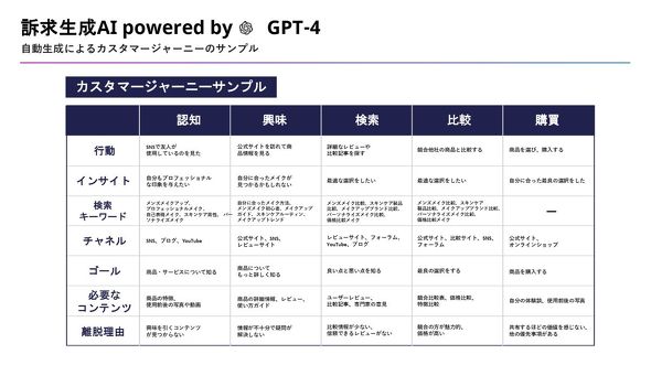 こちらも従来であれば、多くの調査を重ね、膨大なデータを分析する必要がありましたが、「訴求生成AI」を使えば、すぐに認知・興味・検索・比較・購買それぞれのフェーズにおける生活者の行動やインサイトを知ることができます。さらに、「どういう検索をされているか」「どんなコンテンツを見て判断しているか」「購入に至るまでの離脱要因」なども分かるため、さまざまな角度からユーザー分析ができるようになっています。