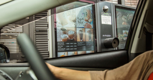 スターバックスは郊外及び地方のロードサイドに出店したことで店舗数を増やした。都内や大阪にも出店しているが、近年の出店情報をみると郊外や地方への出店が目立つ。そして、ロードサイドの新店はドライブスルー機能を設けていることが多い。ドライブスルーの専用レーンがあり、客はマイクで注文を伝え、窓口で商品を受け取るスタイルだ。事前にモバイルオーダーで頼むこともできる。