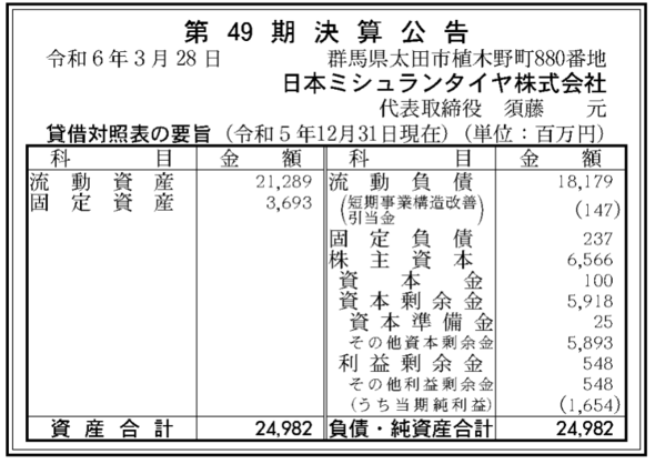 日本ミシュランタイヤが4月15日に官報に掲載した2023年12月期(23年1〜12月)決算公告によると、純利益は16億5400万円(前年同期は17億2000万円)、累積の利益や損失の指標となる利益剰余金は5億4800万円(同11億600万円のマイナス)でした。