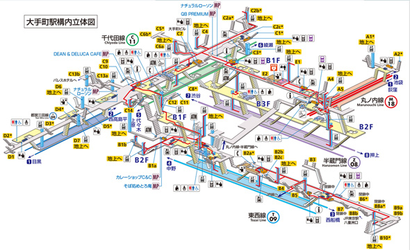 東京の地下鉄で最も多くの路線が乗り入れている駅といえば、大手町駅だ。丸ノ内線、東西線、千代田線、半蔵門線、都営三田線が乗り入れており、駅は地下のフロアを変えて井桁(いげた)のようにできている。こちらも混雑しているものの、案内が多いのでそこまで分かりにくくはないといえる。