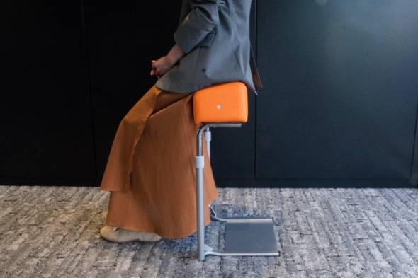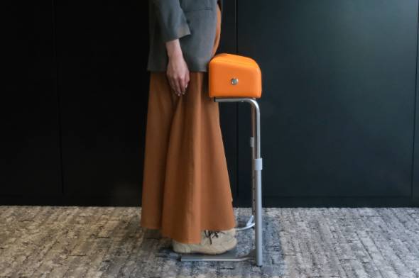 基本的には業務中に座って使用することを想定しているが、立ち姿勢でイスを前に置いて、寄りかかることも可能だという。通常の立ち姿勢より、体の負担が軽減されるそうだ。