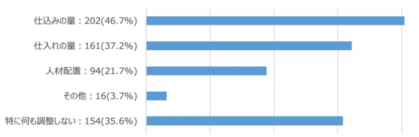 天気予報を参考にどのような調整をしているか聞いたところ、最も多かった回答は「仕込みの量」(46.7%)。「仕入れの量」(37.2%)、「人材配置」(21.7%)と続いた。一方で、「特に何も調整しない」という回答も35.6%に上った。
