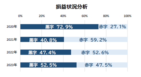 2023年の損益が判明したパチンコホール経営法人の損益状況を分析したところ、黒字企業の割合が52.5%だった。コロナ禍で業績が悪化した2021年には約6割の法人が赤字となっていたが、業績は徐々に回復し、3年ぶりに黒字法人が半数を超えた。