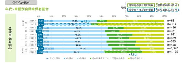 例えば、デロイト トーマツ コンサルティングが2023年11月に発表した「Post COVID-19の移動に関する消費者意識調査」では、年代別の自動車保有割合が明らかになっている。調査結果によると「保有経験なし」と回答した18〜29歳は、2018年に45.8%だったところ、2023年には52.9%と半数以上に達した。30代以降はおおむね20〜30%台にとどまっていることを考えると、若年層の「クルマ離れ」は突出した傾向といえる。