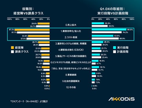 DX導入の目的で最多だったのは「業務効率化/省人化」、次いで「コスト削減」「売上拡大」「基幹システムの刷新、再構築」だった。DX導入の目的を経営陣と課長クラス、実行段階と計画段階で比較しても、同じような割合となった。