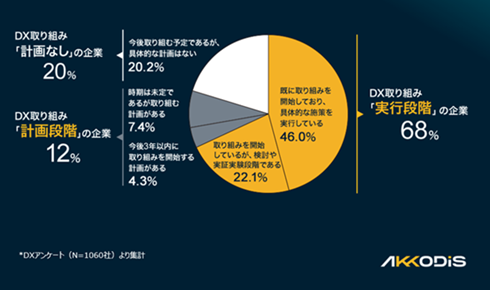 コンサルティングサービスを提供するAKKODiSコンサルティング(東京都港区)は、従業員300人以上の企業に勤める経営層と課長クラスのビジネスパーソンを対象に、「自社内のDXへの取り組み状況や課題」について調査した。DXの取り組み状況について、「実行段階」と答えた割合は全体の68%、「計画段階」が12%と、すでにDXの取り組みを実行している企業は合わせて8割を占めることが分かった。