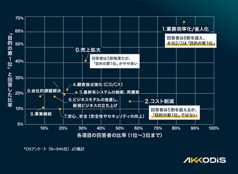 また、「DX導入の目的」で優先順位を1位と回答した項目を分析すると、「業務効率化/省人化」が約6割と最も多く、次いで「売上拡大」が約4割だった。一方、回答数が2位だった「コスト削減」を1位に選んでいる企業は15%にとどまった。