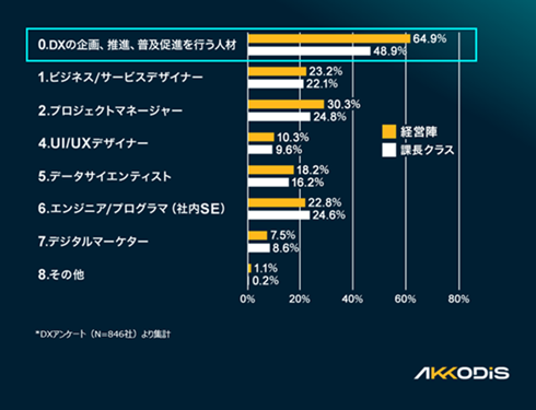 DXを導入する上で不足している人材を聞いた。1位は「DXの企画・推進・普及ができる人材(プロデューサー)」で、経営層は64.9%、課長クラスでは48.9%が回答。2位は「プロジェクトマネージャー」(経営層30.3%、課長クラス24.8%)、3位は経営層からは「ビジネス/サービスデザイナー」(23.2%)、課長クラスは「エンジニア/プログラマー(社内SE)」(24.6%)だった。