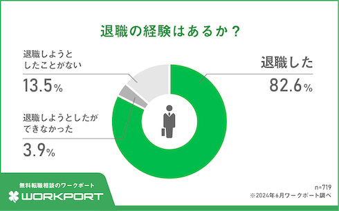 退職の経験がある人は82.6%だった。「退職しようとしたができなかった」と回答した人は3.9%。できなかった理由では「会社から引き止められたため」(20代女性)、「転職先が決まらなかったため」(40代男性)といった意見があった。