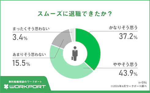 退職経験がある人のうち、スムーズに退職できたのは「かなりそう思う」(37.2%)と「ややそう思う」(43.9%)を合わせて81.1%。一方で「あまりそう思わない」と回答した人は15.5%、「全くそう思わない」は3.4%だった。