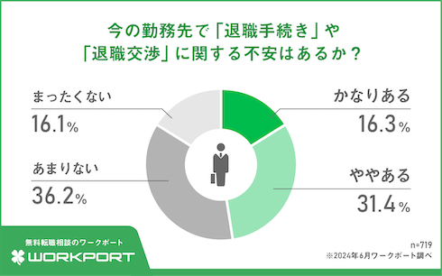 退職に不安を持つ人はどれくらいいるのだろうか。ワークポート(東京都品川区)が調査結果を発表し、退職の手続きや交渉に関する不安を抱える人は47.7%だと分かった。