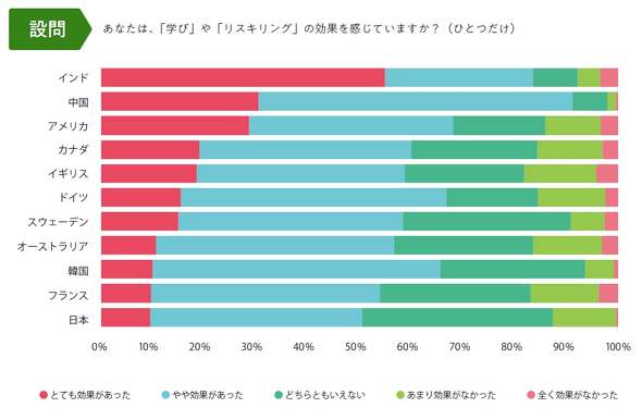 リクルートとIndeed Hiring Labが2023年に行った調査によると、「学び」や「リスキリング」の効果を感じていると答えた人の比率は、中国91.2%、インド83.5%、米国68.2%に対し、日本は50.5%と調査した中で最下位です。せっかく学んでも、日本は諸外国と比べてうまく生かせていない様子がうかがえます。