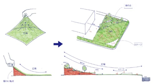 今回の工事では、TOTTEI PARK先端で、エリア全体の緑化空間を一つのピクニックシートに見立て、その一部を「つまみ上げる」イメージで作り上げた高さ10メートル超の建築物を建設。建物の屋根に登れば神戸ウォーターフロントならではの海・六甲山をパノラマビューで堪能できるほか、イベント時には観客席にもなるという。