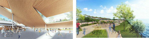建物内には、全天候型の緑や木々が感じられる多目的スペースを用意し、新たなコミュニティプラットフォーム空間を提供する。