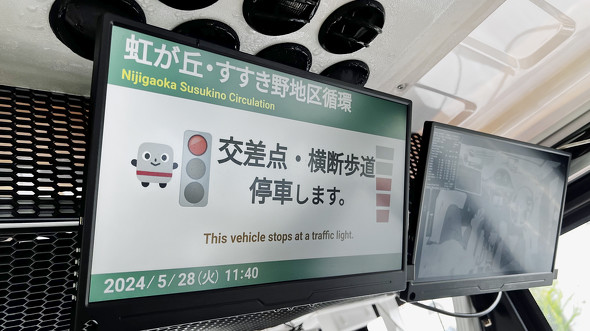 コースは同じだけど、実験内容はアップデートされている。その1つが「信号連動」だ。コース上にある4カ所の交差点で、信号機の切り替わりタイミングをEVバスに伝えて制御する。前回までは交差点では無条件でいったん停止し、運転士の確認動作を必要としていた。今回は信号の切り替わりタイミングを把握できるため、青信号であればそのまま進行する。