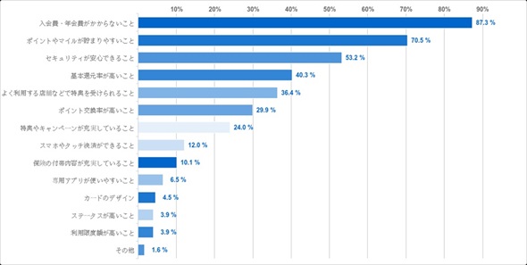 クレカを選ぶポイントで最も多かった回答は「入会費・年会費がかからないこと」(87.3%)だった。以下「ポイントやマイルが貯まりやすいこと」(70.5%)、「セキュリティが安心できること」(53.2%)、「基本還元率が高いこと」(40.3%)が続いた。