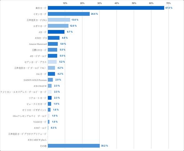 持っているクレカ(複数選択可)では「楽天カード」(67.5%)が最も多く、「イオンカード」(24.4%)、「三井住友カード(NL)」(13.0%)が続いた。