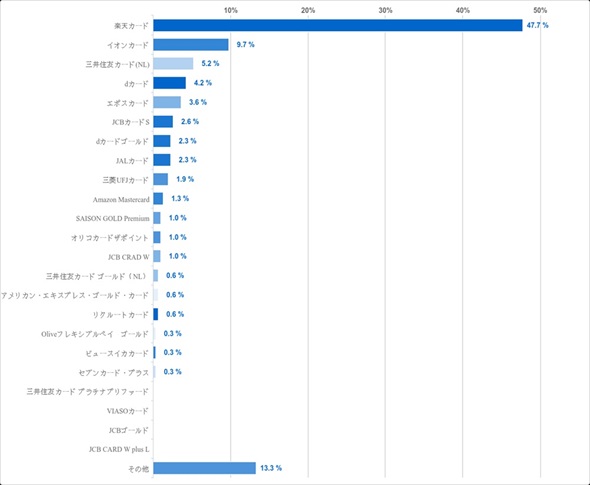 1位の「楽天カード」(47.7%)は、年会費無料やポイント還元率の高さが人気の理由となっていた。2位の「イオンカード」(9.7%)はイオングループでの利用特典が魅力とされ、3位の「三井住友カード(NL)」(5.2%)はトラブル時の迅速なサポート体制が評価された。