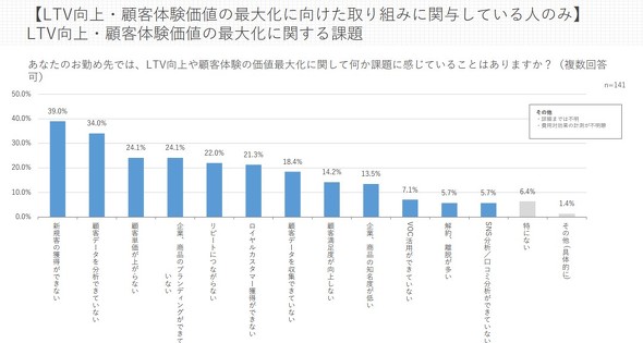 LTV向上や顧客体験の価値最大化に関する課題を聞くと、約4割は「新規客の獲得ができない」と回答した。