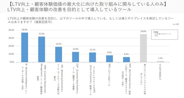 実際のツール導入状況を聞くと「BI(Business Intelligence)ツール(データの収集・分析)」が36.9%、「CRM(Customer Relationship Management)ツール(顧客関係管理)」は31.9%。ツール導入はまだ道半ばのようだ。