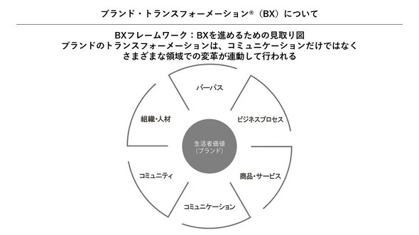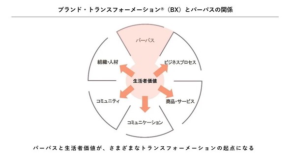 併せて、博報堂では、「ブランド・トランスフォーメーション(BX)」ということも提唱していて、ブランドを起点とした事業変革を推奨しています。BXは、いわゆる広告コミュニケーションに限らず、さまざまな領域での変革が連動して行われることが特徴ですが、中でも重要になるのが、ブランドのコンセプトやビジョンを集約した「パーパス」です。