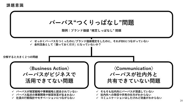 もう一つは、コミュニケーションの問題です。パーパスが社内外と共有できていない、そもそも社内外にパーパスが浸透していない、社内外への発信共有の仕方が分からない、コミュニケーションはしたけれど効果が分からないといった課題があります。