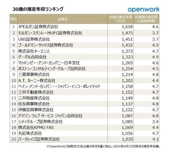 転職・就活の口コミプラットフォームを運営するOpenWorkは「30歳の推定年収が高い企業のランキング」を発表した。1位は「JPモルガン証券」(1618万円)だった。