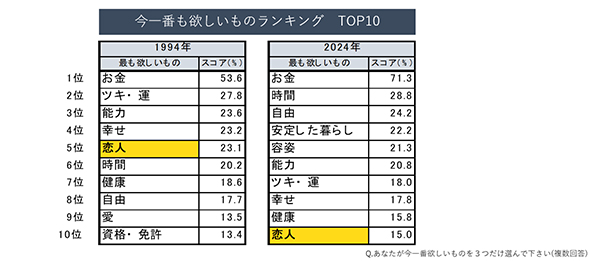 また「今一番欲しいもの」をランキング化したところ、「恋人」は1994年の5位(23.1%)から2024年の10位(15.0%)と大きく順位を下げていた。