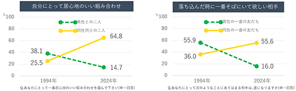 「自分にとって居心地のいい組み合わせ」と「落ち込んだ時に一番そばにいてほしい相手」を聞いた。1994年ではどちらも「異性」が多数派(38.1%、55.9%)だったが、2024年ではどちらも「同性」が上回った(64.8%、55.6%)。