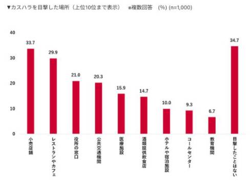 カスハラを「目撃したことはない」とした人は34.7%にとどまり、6割以上の人が何かしらのカスハラを見たことがあるという結果に。具体的に目撃した場所は「小売店舗」が最も多く33.7%。その他「レストランやカフェ」(29.9%)、「役所の窓口」(21.0%)、「公共交通機関」(20.3%)が上位となった。
