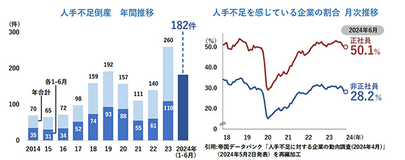 人手不足による企業経営への影響が、一段と深刻化している。帝国データバンクが調査結果を発表し、2024年上半期は人手不足倒産が182件発生しており、年間として過去最多を大幅に上回るペースで推移していることが分かった。
