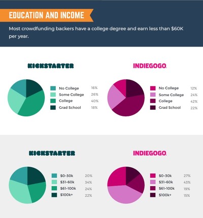 また、Kickstarterにおける支援者の46%は年収6万ドル以上、22%は10万ドル以上である。比較的多くの可処分所得を持ち、新しい体験やプロジェクトに対する支援を行う余裕があると思われる。加えて、支援者の約9割近くは大学教育を受けており、知識やスキルが高い層である。この層は新しいアイデアや技術に対する関心が高く、クラファンを通じてそれらをサポートすることに意欲的であると考えられる。