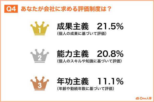 しかし、現在の勤務先の評価制度は理想と同様で、1位は「成果主義」(18.9%)だった。以降も同様に「能力主義」(17.9%)、「年功主義」(16.3%)と続いた。