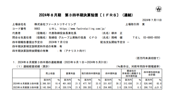 「ユニクロ」や「GU」などを展開するファーストリテイリングは7月11日、2024年8月期第3四半期(23年9月〜24年5月)決算を発表した。国内外の事業がともに好調で、売上高は2兆3665億円(前年同期比10.4%増)、営業利益は4018億円(同21.5%増)と、大幅な増収増益となった。