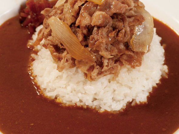 併設店とはいえ、こちらも同様に店内がはっきりと仕切られているわけではなく、券売機で購入しセルフ式で取りに行くシステムである。メニューを見るとその豊富さに圧倒される。3業態の複合店では通常の牛めしメニューに加え、松のやのとんかつ・揚げ物メニュー、そこにマイカリー食堂のカレーメニューが加わる。シンプルなカツカレーや、牛肉がカレーに乗った「カレギュウ」など、食材をある程度は共通化しているようだが、それにしても豊富な品ぞろえだ。「一つの飲食店」というよりは、フードコートに近いといえる。