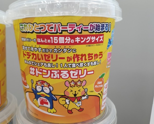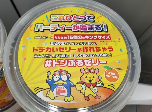 ゼリーは、底面の直径が約14.5センチ、高さが約11.0センチ、上部面の直径が約13.5センチ、重さは約1.5キロだ。パッケージでは「これひとつでパーティーが始まる!」「普通のゼリーのなんと約15個分のキングサイズ」とアピールしている。
