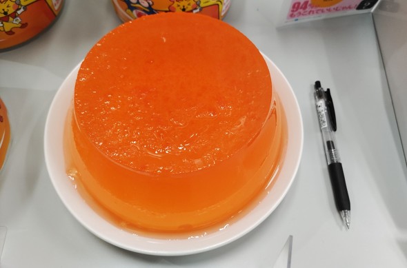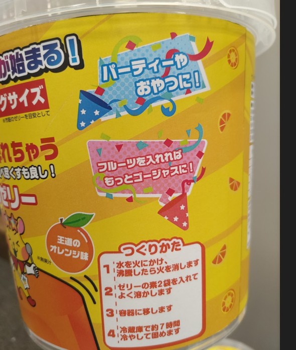 この大型ゼリーは家庭やパーティーで楽しむことを目的にした商品で、容器はバケツのような形をしている。1.4リットルの水を入れた鍋を火にかけて、沸騰したら付属のオレンジゼリーの素を入れる。ゼリー液の粗熱がとれたら、容器に流し入れ、冷蔵庫で冷やして固める。7時間程度経過したら、容器から取り出して皿に盛りつけるという流れだ。